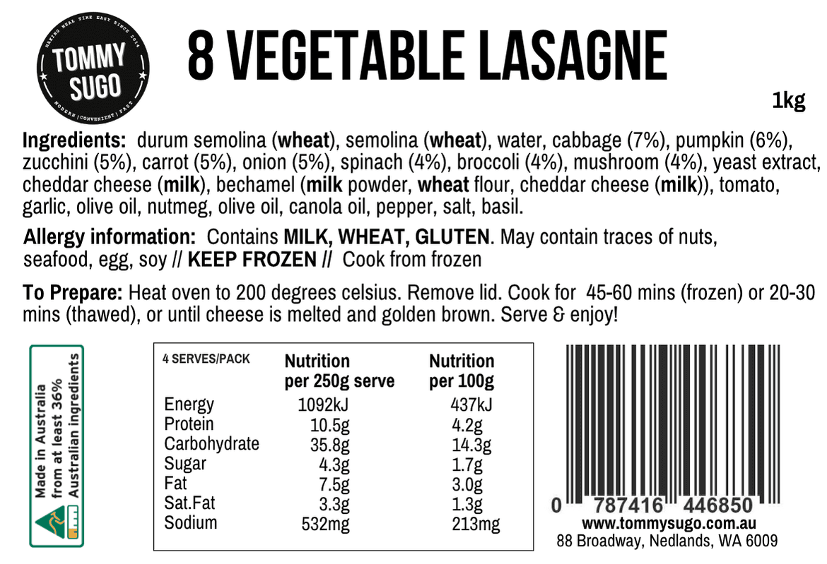 | Ingredients | Durum semolina (wheat), semolina (wheat), water, cabbage (7%), pumpkin (6%), zucchini (5%), carrot (5%), onion (5%), spinach (4%), broccoli (4%), mushroom (4%), yeast extract, cheddar cheese (milk), bechamel (milk powder, wheat flour, cheddar cheese (milk)), tomato, garlic, olive oil, nutmeg, olive oil, canola oil, pepper, salt, basil. |