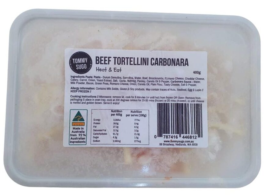 Our Beef Tortelloni Carbonara is the perfect meal heat & eat single serve meal for 1 for those who want to enjoy a hearty, delicious dinner without the fuss. Made with premium local Harvey beef and other great local ingredients with loads of flavour, then cooked to perfection and frozen to lock in all the yumminess! With our convenient Heat & Eat packaging, you can enjoy a delicious meal in just minutes. Simply pop it in the microwave for a quick and easy dinner that tastes like it’s been cooked from scratch. Thanks to our new single-serve packs, you can enjoy a perfectly portioned meal that’s just the right size for one.