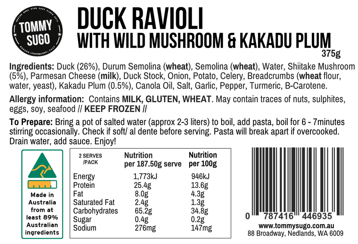 | Ingredients | Duck(26%), Durum Semolina, Semolina, Water, Shiitake Mushroom(5%), Parmesan Cheese, Duck Stock, Onion, Potato Flakes, Celery, Breadcrumbs, Kakadu Plum(0.5%), Canola Oil, Salt, Garlic Granules, Pepper, Turmeric, B-Carotene |