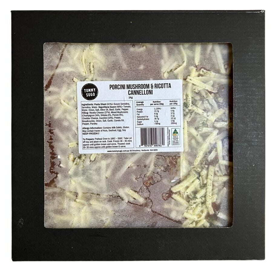 | Ingredients | Pasta sheet – durum semolina (wheat), semolina (wheat), water. Napolitana sauce – tomato, water, onion, salt, olive oil, basil, garlic, pepper. Filling – ricotta cheese (milk) (27%), mixed mushrooms (champignon 24%, shitake 6%, porcini 5%), cheddar cheese (milk), zucchini, potato, breadcrumbs (wheat flour, water, yeast), onion, salt, garlic, canola oil, pepper, parsley. |