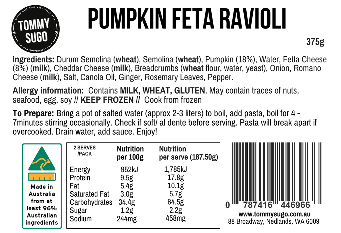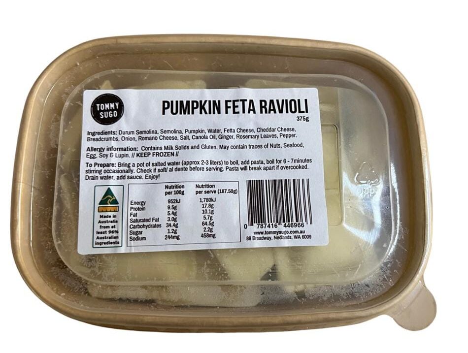 Introducing our Pumpkin & Feta Ravioli, a classic and delicious choice for pasta enthusiasts. Crafted with thin, mouthwatering pasta, each bite is a delightful blend of flavours. The rich and savoury filling combines the creaminess of feta cheese with the earthy sweetness of pumpkin, creating a truly irresistible combination. For a truly unforgettable dining experience, pair our Pumpkin & Feta Ravioli with our homemade napolitana sauce. Its tangy tomato base perfectly complements the flavours of the ravioli, enhancing every bite. To take it to the next level of indulgence, add a touch of cream to the sauce for a luxuriously smooth finish. Each package of our Pumpkin & Feta Ravioli contains 375g, serving two people comfortably. Whether you’re looking for a cozy meal for two or a delightful treat for yourself, this pasta dish is sure to impress. Don’t miss out on this amazing culinary experience!