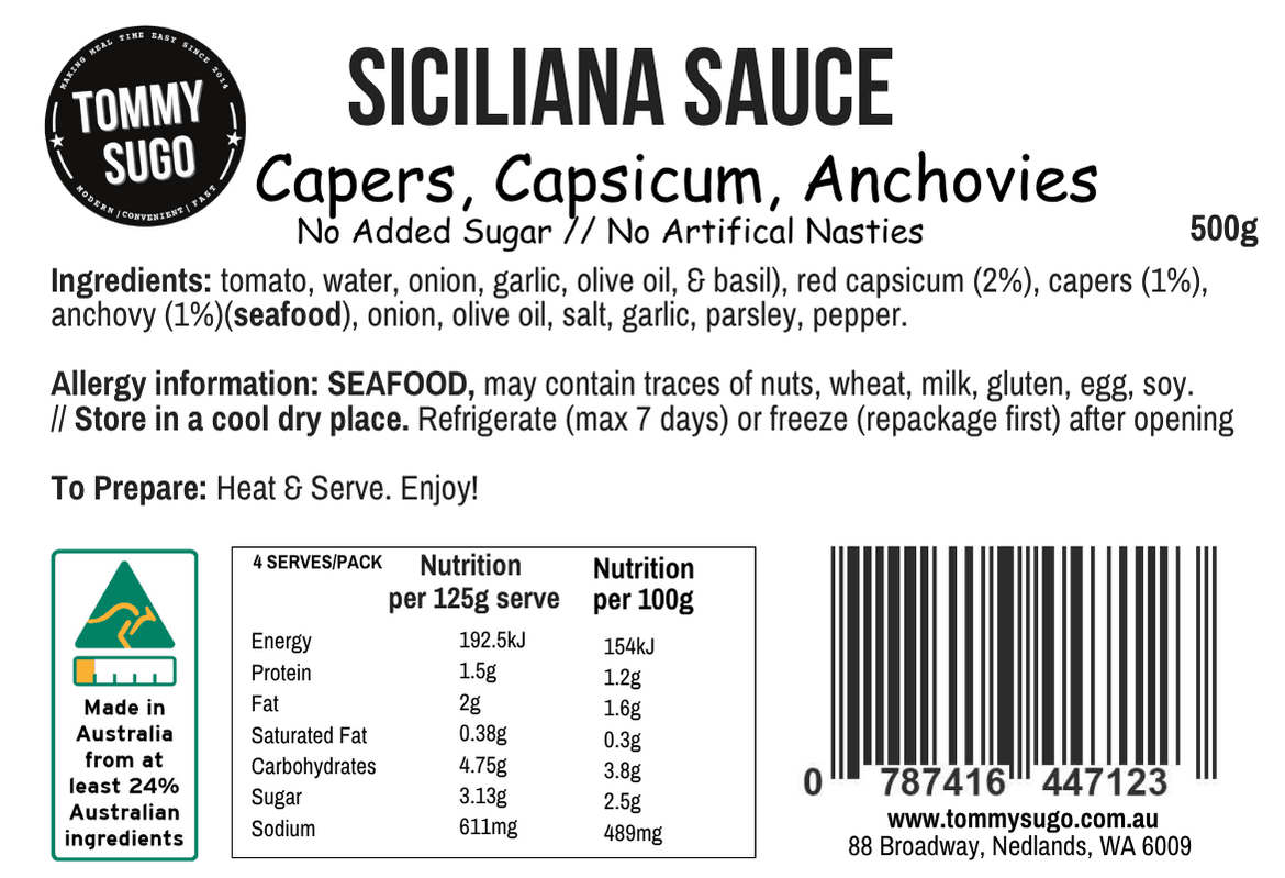 | Ingredients | Tomato, water, onion, garlic, olive oil, & basil, red capsicum (2%), capers (1%), anchovy (1%) (seafood), onion, olive oil, salt, garlic, parsley, pepper. |